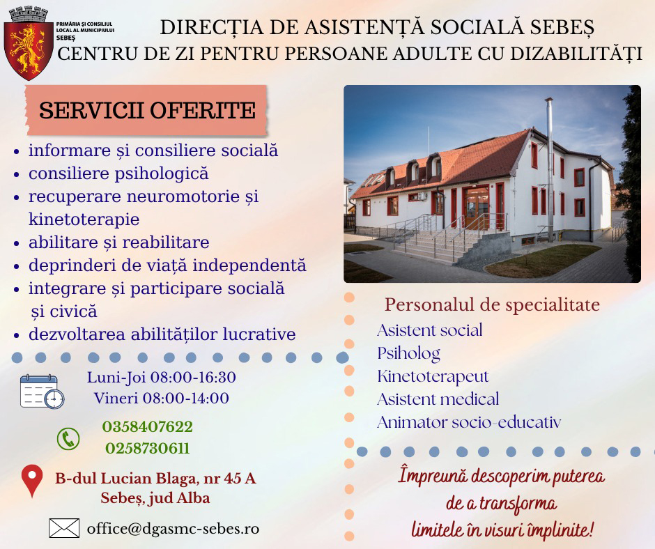 Direcția Generală de Asistență Socială, Medicală și Comunitară Sebeș a demarat în luna mai 2023 implementarea proiectului „Reabilitare și dotare Centru de zi pentru persoane adulte