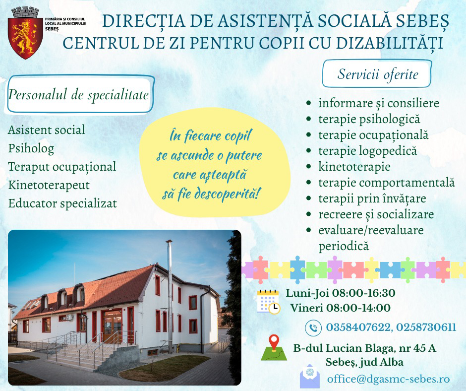 Centrul de Zi pentru Copii cu Dizabilități Sebeș oferă sprijin specializat, terapie și activități educative pentru dezvoltarea și integrarea copiilor, într-un mediu sigur și prietenos! Centrul