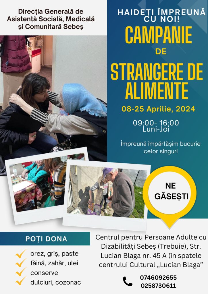 Alimentele pot fi donate în fiecare zi de luni până joi între orele 09.00-16.00 la Centrul de Zi pentru persoane cu dizabilități (Trebuie), Sebeș, str. Lucian Blaga nr. 45A (în spatele Centrului Cultural „Lucian Blaga”), în perioada 08.04.2024-25.04.2024.